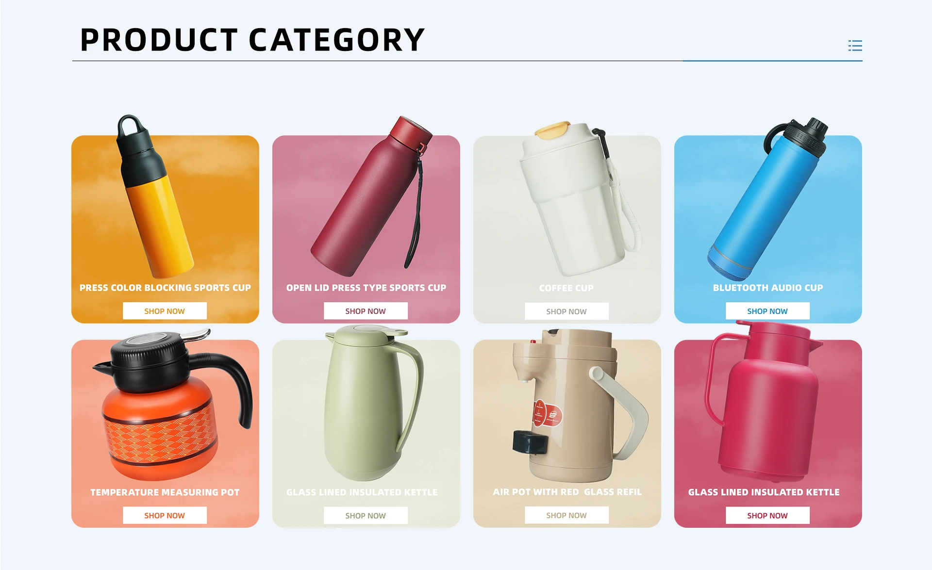 Productos principales:Botella de agua, taza de café, termo, cafetera, juegos de herramientas de barra